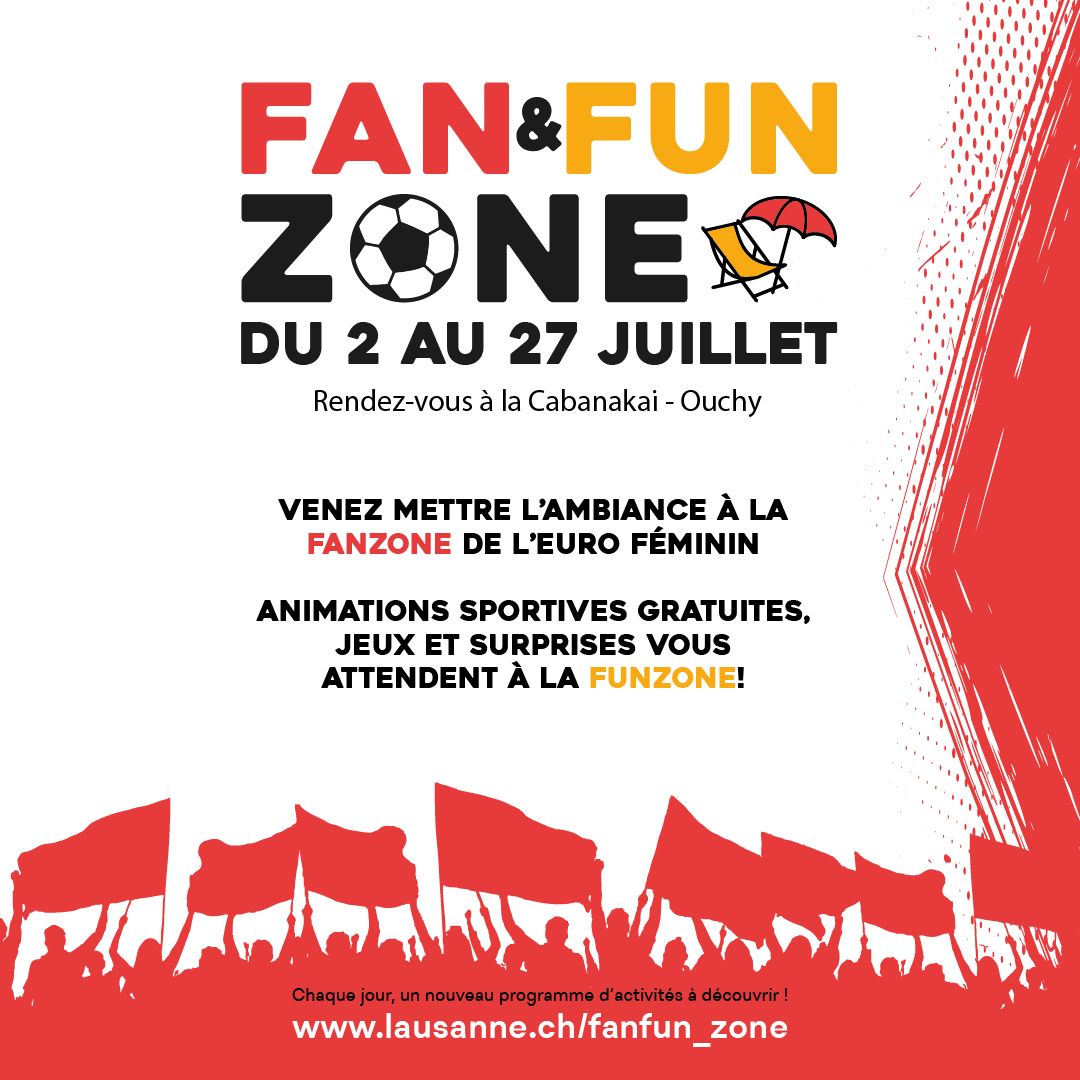 La Ville de Lausanne met en place une Fan & Fun Zone qui vous accueille du 2 au 27 juillet 2025 à Ouchy pour célébrer le sport féminin dans une ambiance festive, inclusive et 100% gratuite.