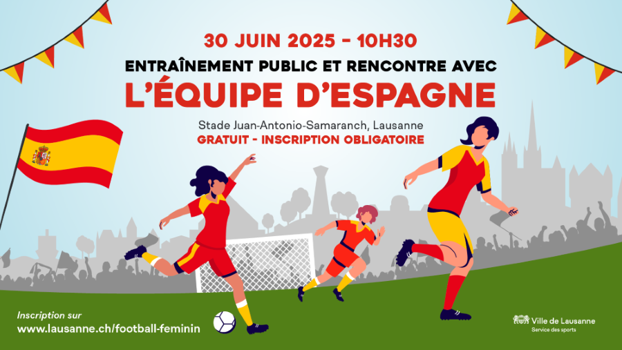 Les joueuses de l’équipe d’Espagne, championnes du monde de football en titre, arriveront à Lausanne le 29 juin 2025. La population est invitée à venir nombreuse les accueillir sur les derniers mètres avant leur hôtel en formant une haie d’honneur color